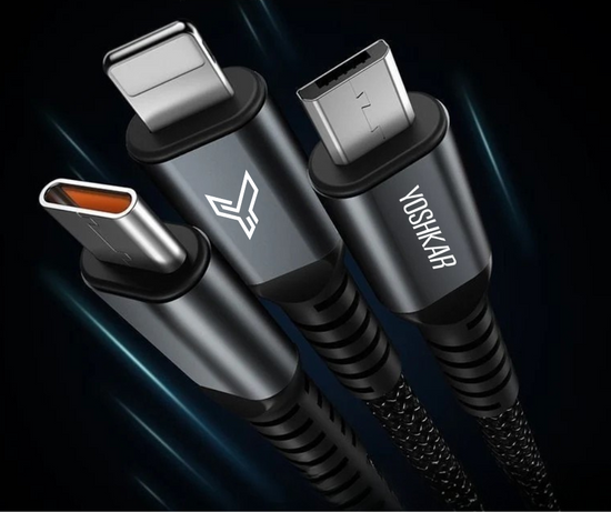 Experience ultimate versatility with the YOSHKAR 4-in-1 cable, delivering up to 65W fast charging with a robust, durable design. Featuring interchangeable connectors for USB, Type-C, and Lightning, this cable powers a wide range of devices efficiently and reliably — all in one smart, durable solution.
